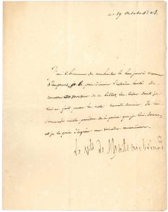 « Le Vte de Chateaubriand », 19 octobre 1814, à Joseph Van Praet, « Conservateur de la bibliothèque du Roi » ; 1 page petit in-4, adresse. Emprunt de livres à la Bibliothèque royale. Il souhaite le bon jour à M. Van Praet, et « le prie d’avoir l’extrême bonté de remettre au porteur de ce billet, les livres dont je lui ai fait passer la note samedi dernier »... On joint une P.A.S. de Joseph Van Praet, 16 mai 1810 ; et un dessin signé et légendé par Ferdinand Bac, portrait de Victor Cousin (avec la photo ayant servi de modèle).