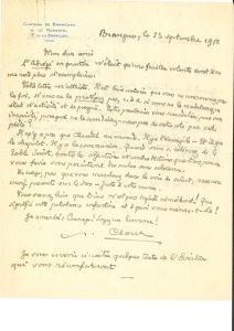 Brangues 23 septembre 1952, à un ami ; 1 page et demie in-4, en-tête Château de Brangues. L’Abrégé en question n’était qu’une feuille volante dont il ne lui reste plus d’exemplaires. « Il est bien certain que vous ne conserverez pas la foi, si vous ne la pratiquez pas, c. à d. si vous ne la maintenez en état d’activité et de progrès. Votre prochain vous scandalise par son impiété, pourquoi ne le scandalisez-vous pas de votre côté par votre piété. Il n’y a pas que Claudel au monde. Il y a l’évangile – et il y a le chapelet. Il y a la communion. Quand vous v. relèverez de la Table Sainte, toutes les objections et contradictions que l’on pourra vous faire vous paraîtront des ombres sans substance. Ne croyez pas que vous marcherez dans la voie du salut, sans une croix pesante sur le dos – juste à votre mesure. Vous savez bien que Dieu n’est pas injuste ni méchant ! Que signifie cette pétulance enfantine et à quoi vous mènera-t-elle ? Je vous dis : Courage ! Soyez un homme ! »… Au dos, Claudel a copié des textes de l’Écriture pour le réconforter...
