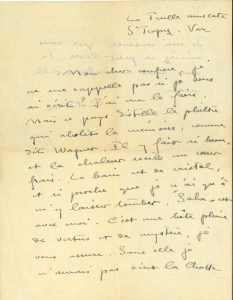 La Treille muscate, Saint-Tropez, [1933], [au journaliste Louis-Jean Finot] ; 1 page et demie in-4. Après la parution de La Chatte (juin 1933), elle jouit de ce pays qui « distille le philtre qui abolit la mémoire, comme dit Wagner. Il y fait si beau, et la chaleur recèle un cœur frais. Le bain est de cristal. […] “Saha” est avec moi. C’est une bête pleine de vertus et de mystère, je vous assure. Sans elle, je n’aurais pas écrit la Chatte. Je suis contente que vous aimiez ce petit livre »…