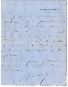 43, avenue de St Mandé 1924 et s.d., à une dame ; 3 pages et demie petit in-4 à son adresse. 17 mars 1924 : pour les conseils, « je suis malheureusement trop vieux pour commettre encore l’imprudence d’en donner. C’est bon pour les tout jeunes gens »… 28 mars 1924 : la pièce inachevée l’a « assez amusé ; le point de départ en est plaisant et pas mal développé du tout. Ne jetez donc pas votre œuvrette au brasier »… – Sa situation de « membre du comité de la Société Française du Théâtre m’interdit de prendre connaissance de tout manuscrit destiné à être soumis à son approbation »…