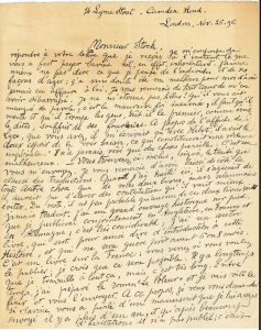 Londres, 26 novembre 1896, à l’éditeur P.V. Stock ; 1 page et quart petit in-4. Il remercie Stock de l’avoir « débarrassé » de Savine, son premier éditeur : « c’est la mauvaise foi incarnée ; il faut qu’il mente et trompe les gens », et il renvoie le traité conclu avec Stock. Il a un ouvrage historique prêt, et travaille à un autre livre « qui sert pour ainsi dire d’introduction à cette Histoire, et qui ne sera guère prêt avant 5 ou 6 mois. C’est un livre sur la France. […] Entre temps, j’ai préparé le roman Le Voleur et je vais vite le finir et vous l’envoyer ». Il avait envoyé à Savine un manuscrit qu’il n’a pas publié : « c’était intitulé Le dernier anarchiste. Je ne pense pas qu’il vous en ait parlé. – Sur les nouveaux exemplaires, je vous prie de n’annoncer : Pour paraître que : “Le Voleur. Roman”. C’est bien assez »…