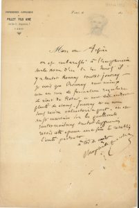 Paris [janvier 1852], à Arsène Houssaye ; 1 page in-8, en-tête Imprimerie-librairie de Pillet fils aîné, adresse. Lettre illustrée en tête d’un portrait au crayon de Houssaye. [À propos d’une nouvelle de Houssaye, Mademoiselle de Corneilles, publiée sous pseudonyme dans La Revue de Paris de février 1852.] « On est embarassé à l’imprimerie sur le nom d’un de tes héros. Il y a tantôt Rouvray tantôt Jouvray. Je crois que Rouvray vaut mieux c’est un nom de formation régulière il vient de Robur et veut dire endroit planté de chênes. Jouvray est un nom sans racine calembour à part. On est aussi incertain sur les guillemets tantôt maintenus tantôt supprimés. Revois cette épreuve avec soin et rétablis l’unité partout »… On joint une L.A.S. de sa fille Judith Gautier, suppliant un ami de voter pour « cette admirable jeune fille qui est Lili Boulanger » ; une L.A.S. de son gendre Émile Bergerat, faisant campagne pour succéder à Coppée à l’Académie, [1908] ; une lettre adressée à Estelle Gautier d’une proche de la Princesse Mathilde ; un ex-libris au monogramme de Gautier, gravé par Aglaüs Bouvenne ; un petit ensemble de portraits, dont un par Nadar, et divers documents.
