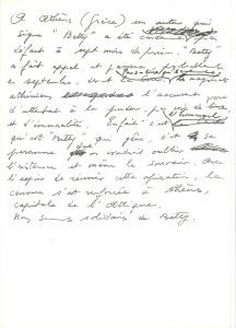 1 page in-8, avec ratures et corrections. Brouillon d’un appel en soutien à Betty, travesti grec. « à Athènes (Grèce) un auteur qui signe Betty a été condamné par défaut à sept mois de prison. Betty a fait appel, et passera, probablement en septembre, devant la Cour. Pour son livre qu’ils condamnent, les magistrats athéniens l’accusent d’attentat à la pudeur, par voie de presse, et d’immoralité. En fait c’est l’homosexuel qu’est Betty qui gêne, c’est sa personne dont on voudrait oublier l’existence et même le souvenir. Avec l’espoir de réussir cette opération, la censure s’est renforcée à Athènes, capitale de l’Attique. Nous sommes solidaires de Betty ». On joint une liste autographe de noms de personnalités à contacter (complétée par Paule Thévenin) : Paule Thévenin, Bernard Noël, Jacques Derrida, Michel Butor, Gilles Deleuze, Claude Mauriac, etc.
