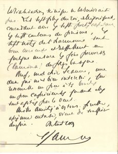 Hasparren 6 août 1930, à Jeanne René Chauvet à Vichy ; 3 pages in-4, enveloppe. Au sujet d’une pièce de théâtre sur Gilles de Rais dont elle lui a soumis le manuscrit. [Jeanne Chauvet (1902-1998) était la femme du militant socialiste René Chauvet, maire de Nahuja (Pyrénées-Orientales) de 1968 à 1983. La pièce ne semble pas avoir été publiée ni représentée.] Il a lu son drame « sur Gilles de Rais dont la chronique a excité tant d’imaginations, suscité la légende que tu sais, inspiré aussi Huysmans et autres dépouilleurs de grimoires. Il est certain que tu fais ressortir avec beaucoup de brio cette étrange destinée dont il semble que tu atténues ou du moins diminues les crimes sataniques. Il me semble, en effet, avoir lu qu’ils passèrent en nombre, cinq cents. Le procès fut l’un des plus solennels et effrayants du Moyen-Age. Et il me semble que parce que ce héros de l’infernal abîme fut le compagnon de Jeanne d’Arc, en effet, Satan a voulu dresser en face du procès de Rouen d’autres assises qui lui fissent pendant en horreur. Ce décor, tant soit peu wagnérien, que tu dresses autour de cette chronique en corrige un peu la crudité, réagit contre tant de sadisme – que tu ne fais d’ailleurs que dénoncer, dénombrer – et ton idée de rédemption est apaisante comme elle l’est dans Faust en proie à Méphistophélès. Je ne pense pas que ce drame puisse être représenté car l’imagination y court si vite que la réalisation scénique ne la suivrait pas »…