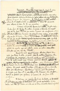 [1922] ; 29 pages in-fol. Intéressant ensemble de cinq manuscrits de travail – version primitive complète, mises au net partielles, et version révisée complète, toutes retravaillées, avec de nombreuses ratures et corrections – de ce conte publié dans la Nouvelle Revue française du 1er octobre 1922, et recueilli dans Les Pincengrain (Éditions de la Nouvelle Revue Française, 1924). Ces manuscrits permettent de suivre les étapes et le remarquable travail de création du peintre de Chaminadour, pour arriver à la prose glaçante et ironique du bref conte. Ainsi pour le début, abondamment raturé dans la toute première version : « Il y a 4 maisons dans la rue de la cure. Sous les yeux du Seigneur, le Presbytère est bien gardé. Dans la 1ère habite un incendiaire, dans la seconde une voleuse et dans la 3e un assassin »… C’est seulement au quatrième manuscrit, autre version complète du conte, que l’auteur abandonne le nom primitif de l’assassin : « Charlemagne » devient « Clodomire », puis « Clodomir »...