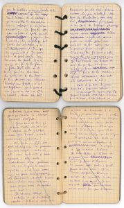 décembre 1944-décembre 1945 ; 460 pages petit in-12 (12,5 x 7,5 cm) de feuillets volants de papier quadrillé et perforés, formant 5 carnets factices liés par des cordelettes ou des ficelles (certains numérotés au crayon rouge).Carnets intimes recueillant, en premier jet, des observations, anecdotes, bribes de dialogue, notes de lecture, minutes de lettres et réflexions, la plupart barrées d’un trait oblique, et qui ont pu être réutilisées et remaniées dans des livres comme Essai sur moi-même (1946), Carnets de Don Juan (1947) ou Ménagerie domestique (1948) ; ils sont probablement en grande partie inédits. Nous n’en citerons que de très brefs extraits. * Carnet 1, tenu depuis décembre 1944, et « terminé le 1er mars 1945 » (126 p.). « Je me suis appliqué cinquante ans à faire de mon âme “un diamant” que rien ne puisse entamer. Le moment est venu d’en éprouver la durée, peut-être l’éclat ». « Avec Élise, du haut et du bas, de très haut à très bas. Jamais encore il ne lui était arrivé de m’humilier comme vendredi devant quelqu’un d’autre. Maintenant c’est fait. Bien sûr pour aussitôt me ramasser où elle m’a jeté et m’embrasser et m’obliger à l’embrasser avec une sorte de passion désespérée »…* Carnet tenu du 1er avril au 11 mai 1945 (64 p.). Notes grammaticales, comptes, numéros de téléphone, idées de titres… Brouillon de lettre à Jean : « Tu as des vices. Tu n’as pas de besoins. Un vice respecté, s’il est dévorant, peut servir non seulement à l’équilibre de l’être, mais le conduire même à une sorte de détachement »... « Voilà le vrai, le seul théâtre de l’apparence et du mensonge : une ou deux fois je m’y suis senti poussé par une main qui ressemblait à celle de la curiosité, mais pas une seconde je n’y fus dupe »...* Carnet 5, du 23 août au 7 septembre 1945 (89 p.). « Au fond rien ne m’invite ni m’incite [...] à dire et à écrire tout bonne. des incongruités comme un sérieux de pacotille, mon tempérament ayant beaucoup plus d’affinités avec celui d’un truand que d’une mijaurée de n’importe quel sexe et ma main beaucoup plus d’aptitude au fond à lancer la bombe atomique [...] qu’à jouer au bilboquet »... « Simple mouvement de l’âme. Inutile de se demander si ta barbe aura son influence et tout de suite sur ton style. C’est en signe de deuil que je l’ai laissé croître, comme on se voile, pour ne pas voir la stupeur s’installer sur mon visage, la stupeur de la mort, le reflet blême de la rive maudite. Non, je n’ai pas aimé la mort »... « Des rêves étranges cette nuit : le plus étonnant. J’étais le complice d’un cambriolage qu’un monstre devait réaliser un préjudice de mes parents. Mais comment ce pacte avait-il été conclu ? Je revois la tête du cambrioleur et la nuit, j’entends respirer mon père et ma mère dans leur chambre, pendant qu’on force les serrures. Plus tard j’étais employé dans un grand magasin », etc. * Carnet 6 des « gdes vacances 1945 » (93 p.). « La jeune fille qui aime un homme marié vient de s’asseoir à son piano pour jouer, en pensant à lui. Il va être onze heures du soir. Les fenêtres de la villa des M. sont ouvertes comme les nôtres et l’on entend sa mère la gronder. Est-ce qu’elle se doute de quelque chose ? [...] La voix s’élève en tempête et les fenêtres se ferment avec fracas, mais comme si rien ne se passait, le nocturne poursuit son ramage derrière les branches du tilleul qui nous sépare. Toutes ces scènes et ces remarques, pendant une lecture que je fais à Élise et qui la ravit sur le P. Malebranche »... « César, Michel-Ange avaient beau aimer les beaux hommes, qui fut plus viril qu’eux ? Dans leur personne, dans leurs œuvres. Aujourd’hui, nos garçons, même quand ils aiment les femmes sont plus femme qu’elles par le mouvement de leurs hanches et l’intempérance de leurs gestes. S’aiment-ils entre eux, ils ne sont même pas des femmes et ils ne sont plus des hommes, ils ne seront plus jamais rien qu’on puisse nommer dans aucune langue sans mépris »... « Aie le respect de tes génitoires comme de tes yeux »... « Eric. Vous et moi, c’est autre chose : un engagement du cœur et une familiarité qui me fait souvent oublier le respect que je vous dois parce que je vous tiens pour un complice. La maladie est l’école de la mort. L’oubli se referme sur vous si vite »... « Je n’ai jamais pu songer à l’amour que mon corps sain. Dès qu’il porte la moindre égratignure, la moindre fêlure, je m’en détourne »... « Tu dis bien, on s’y habituera comme le sage à s’asseoir sur son lotus. Je parle de la bombe »... « Mes loisirs de convalescent je les emploie à classer mes lettre, à en détruire beaucoup, ce qui ressemble à un examen de conscience »... * Carnet 8, du 6 novembre au 22 décembre 1945 (88 p.). « Je sens tous les maux à la fois ; ce n’est pas seulement une menace ; ils me sont présents. Je vois Carya morte. Je vois la paralysie s’emparer de moi ou d’autres bourreaux »... « Rien de plus difficile à reconnaître qu’un beau garçon à une époque divine. Ils sont tous pareils »... « La douleur entre parfois dans votre chair même par l’âme. On ne sent tant de maux dans chaque parcelle de son corps parce qu’on n’en est plus distrait par le concert de l’esprit qui a cessé tout d’un coup »...