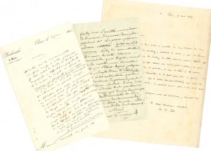 2 L.A.S., 1849-1854 ; 1 page in-4 chaque, une adresse. Paris 9 mars 1849, à M. Stourm, Représentant du peuple ; en faveur d’un de ses frères « architecte de mérite, qui se trouve en ce moment, par suite des événements de 1848, dans une position difficile ». Toulouse 24 février 1854, à la princesse de Beauvau. Il la remercie de sa bonté pour leur Chapelle des Carmes et d’autres lieux de culte, générosité qui fait d’elle « l’une des bienfaitrices de notre ordre. Cette persévérance de votre charité pour nous me rappelle [...] les heures agréables que j’ai passées à Haroué »... On joint une L.A.S. de Mgr AFFRE, archevêque de Paris, 5 janvier 1847, sur l’occupation du Temple par les religieuses après la destruction de la prison ; et une L.A.S. de l’abbé SICARD, 7 nivôse, au sujet de son Épitre au sens commun, dirigée contre « une nouvelle secte qui s’élève depuis quelques temps, sous le nom d’Idéologie, et qui n’est pas contre chose que le matérialisme et par conséquent l’athéisme »...