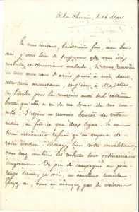 La Chenaie 16 mars [1822, à son « bon ami » le baron de Vitrolles] ; 2 pages et demie in-8. Il était loin de soupçonner son ami si malade. « Je ne serai rassuré qu’en voyant de votre écriture ». Il lui conseille de ménager sa convalescence : les rechutes sont dangereuses. « Un peu de campagne au printemps seroit, je crois, un excellent remède », et il aimerait qu’il le rejoigne à La Chenaie : « Nous causerions, nous nous promènerions à pied, à cheval, selon votre gré. Nous ferions de la politique et de la philosophie, en toute joie et toute liberté, si toutefois joie et politique sont deux choses qui puissent s’allier aujourd’hui. L’avenir me paraît extrêmement sombre, et c’est pourquoi je ne veux pas m’y jeter. Ce seroit comme une seconde maladie qui vous surviendroit. On parle ici d’élections prochaines. On vouloit me nommer, j’ai déclaré que ma résolution étoit prise de ne point accepter. Il faudroit que je fusse terriblement fou pour me jeter dans ce guêpier des chambres. Je n’aurois été cette année presque jamais de l’avis de personne. C’est une position qui n’est pas tenable, quand on est privé de l’avantage de pouvoir faire un parti à soi seul, comme M. Fiévée »… Il lui souhaite une bonne convalescence : « croyez que personne ne vous aime plus tendrement que l’hermite de La Chenaie ». On joint 2 autres petites L.A.S. ; une l.a.s. de l’abbé Nicolas à Lamennais (1833) ; plus un manuscrit : Livre IV, De la Société temporelle (33 p. in-4).