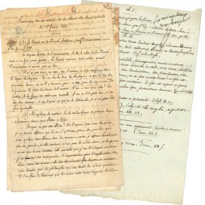 Remarques sur un article de la Revue des deux mondes du 15 février 1841 ; 8 pages in-8. Projet de réponse à la critique de son Esquisse d’une philosophie par Jules Simon dans la Revue des Deux Mondes [Lamennais renoncera finalement à polémiquer]. Lamennais cible 24 points de contestation, renvoyant aux pages de la Revue. « (1) “Sa Trinité est la Trinité chrétienne, sauf l’incarnation et la foi.” P. 535. Le dogme chrétien de l’incarnation se lie à celui de la Trinité, mais n’en fait pas partie. La Trinité resteroit tout entière quand l’incarnation n’auroit pas eu lieu. Il n’est pas vrai, au reste, que l’auteur se soit renfermé dans le dogme théologique. Qu’on cherche dans les théologiens ce qu’il dit des propriétés divines, on ne l’y trouvera pas »… Etc. Il conteste de prétendues contradictions dans son Esquisse, accuse Simon de se livrer non à une discussion, mais à « une chicane verbale, de la subtilité d’école », notamment dans ses remarques sur la psychologie, « du galimathias double et triple »... Etc. On joint 1 page autographe de notes de lecture. Et 21 manuscrits, lettres ou pièces provenant des papiers de Lamennais (1819-1807 et s.d.) : mémoires, notes, lettres sur des sujets divers : principes de la philosophie catholique ou cartésienne ; extrait d’un ouvrage sur les Bible Societies du Révérend O’Callaghan (1816) ; la nature et la Grâce ; la croyance des Celtes (avec bibliographie) ; les religions de l’Asie ; les crimes de lèse-majesté ; un établissement d’études supérieures voulu par le Comité Polonais ; les sociétés secrètes dans le Piémont ; des Observations sur le 2d volume de M. de Mennais ; l’Apocalypse, etc.