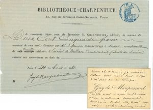à un ami [Pol Arnault] ; 2 pages in-24. Il voulait aller voir son ami hier, mais n’a pas eu le temps. « Faites-moi donc le plaisir avec madame Arnault de venir dîner chez moi ce soir. Et pardonnez-moi de vous inviter si tard. Oui n’est-ce pas ? »… On joint une P.S., Paris 24 avril 1880 : reçu de droits d’auteur pour Boule de suif.