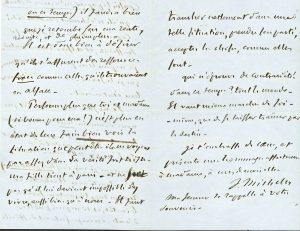 [1849-1857 et s.d.], à son ami Poret, professeur à Paris ; 13 pages in-8, 3 enveloppes. [Royan 20 août 1849]. « Béranger, mon cher ami, est si universellement exploité en ce moment, et par le gouvernement, et par tout le monde, qu’il en fait à qui entendre, et qu’il en mourra, je le crains. Sa recommandation en supposant, qu’on parvînt à l’obtenir, n’aurait pas plus d’effet que tant d’autres qu’il donne tous les jours. […] Quant à Marrast, je ne suis guère lié avec lui, et n’ai guère de sujet de me louer de ses amis. Tu sais qu’ils ont opposé un concurrent à Quinet (M. Séchant) pour la place de colonel »… [Nantes] 23 novembre [1852]. Il remercie Mme Poret de sa bonté au moment de l’accouchement de sa fille [Adèle Dumesnil] ; plaintes sur sa situation matérielle (il vit petitement d’un traité avec Hachette) et l’indécision de ses enfants « entre l’Alsace et Paris »… Nervi 27 janvier 1854. « Le travail ne m’est pas favorable. Je m’en suis aperçu l’autre jour, quand j’ai remanié un petit manuscrit composé presque entièrement de réimpressions (Les Femmes de la Révolution). Cela paraîtra, je crois, en mars »… Fontainebleau [17 juin 1857 ?]. Invitation à rejoindre les Michelet. « Nous n’avons pas fait encore de grandes promenades. Notre installation et l’étude de nos insectes nous ont absorbés »… Puis sa femme Athénaïs prend la plume…