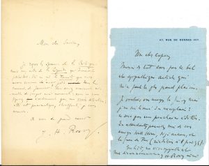 1889-1939 ; plus de 40 pages formats divers, qqs adresses ou enveloppes. À son cher Antoine (réclamant réponse sur le manuscrit de Jacques Fougeraye), à Mme Aurel (3, une acceptant de parler de la poésie en général), à Maurice Bedel, à Georges Dandelot (à propos d’un concert du maître Francis Planté), à Léon Dierx (remerciant pour son magnifique livre, [1912]), à Fernand Divoire (remerciant pour l’Intrans et l’articulet sur Et l’amour ensuite, 1918), à Eugène Fasquelle (résumé de son prochain roman se passant « dans le monde, entre gens du monde), à M. Faucheux (au Temps, 1902), à Paul Fort (pour s’inscrire parmi les abonnés de l’ami et « admiré poète »), à Adrien Hébrard (3, à propos du Docteur Harambur écrit pour Le Temps, 1902), à Victor Joze (remerciant pour un bel et sympathique article, et regrets de ne pouvoir lui envoyer La Juive), à Léon Maitland (remerciant pour d’aimables lignes sur Sous-offs), à Jean Muller (« Qui sait si la fin de l’Humanité n’est pas toute proche ? »), à Porel (recommandant Pierre Denis pour la Porte-Saint-Martin), à Gaston Riou (2), à Jean Royère (3, dont un éloge des Goncourt), à Albert Savine (à propos de sa collaboration à la Revue indépendante, [1889]), à Robert Scheffer (éloge de son Idylle d’un prince, 1894), à Teodor de Wyzewa (remerciant pour Qu’est-ce que l’art de Tolstoï), d’autres à des confrères, amis et critiques, à un ambassadeur… On joint quelques portraits ; plus une carte de visite a.s. de son frère J.H. Rosny jeune à Jean Royère, à propos de Jean-Antoine Nau.