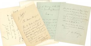1896-1928, à ses éditeurs Plon-Nourrit ; 52 pages formats divers, quelques adresses. Importante correspondance à son éditeur. Ses premières lettres s’adressent à un M. Mériguet, et concernent des nouvelles destinées à La Revue hebdomadaire, que publiait Plon-Nourrit… Demandes réitérées de la date de sortie du Roman d’un cycliste (1896-1899)… Échanges fréquents à propos des droits d’auteur (avances, cessions, reçus)… Protestation auprès de l’éditeur J. Bourdel, qui n’avait mis aucune condition à la publication du Fardeau : « Vous avez librement choisi ce roman entre plusieurs autres, et pour cette année-ci » ([24 juillet 1900])… Autorisation à négocier une édition en anglais de L’Indomptée (1903), réserves sur des traductions en allemand du Dr Harambur (1904-1906), accords pour des traductions en allemand de L’Épave et La Mort de la terre (1912)… Prière d’envoyer La Mort de la terre à Jean de Gourmont pour compte rendu ; il joint une dédicace (1912)… Négociation serrée pour Marthe Baraquin et La Guerre du feu (1915), puis pour La Vague rouge… « J’envisage un petit relancement sans frais pour la Vague – une bande avec en tête : Un livre prophétique » ([mi-juin 1919])… Demande à disposer de nouvelles déjà parues… Cession du Félin géant (1920)… « Je crains que vous n’ayez oublié ma demande concernant Une reine. Je vous demandais si je pouvais faire paraître ce roman dans une collection à bon marché » (1er décembre 1920)… « Que faites-vous pour Les Fiançailles d’Yvonne ? » (8 novembre 1922, et intéressante réponse de l’éditeur sur les idées et les mœurs qui ont évolué depuis la Guerre)… Satisfaction de voir Les Rafales en compagnie de ses autres romans, dans leur collection qui devient célèbre… Question de traductions en polonais, italien, espagnol… Demandes d’exemplaires de Profondeurs, Kyamo, Résurrection, Vamireh… On joint plus de 50 minutes manuscrites ou copies dactyl. de lettres de ses éditeurs à Rosny ; et une soixantaine de lettres ou pièces échangées entre Plon-Nourrit et d’autres éditeurs, directeurs de périodiques, traducteurs, etc., 3 rapports de lecture, des relevés de comptes... Plus un manuscrit de la nouvelle L’Épreuve, avec qqs corrections autographes.