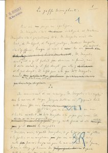 5 pages in-fol. (découpées pour impression et remontées, avec son cachet encre), et 7 pages in-8. Manuscrits de travail, avec ratures et corrections, ayant servi pour l’impression. La Gaffe triomphante est un conte plein de rebondissements, où l’on voit l’étourdie et ambitieuse Mme Margotin l’emporter sur son prudent mari... Grandeur et décadence des machines à vapeur constate le remplacement progressif des machines à vapeur et locomotives par des machines électriques, et l’avion... On joint 4 L.A.S. et un brouillon autographe à propos de la partie inédite du Journal des Goncourt.