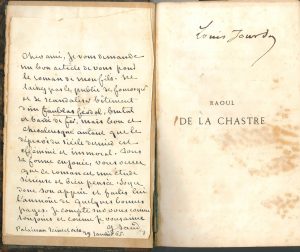 Palaiseau 29 janvier 1865, à Louis Jourdan ; 1 page in-8 (petite déchirure dans le haut sans toucher le texte). Lettre inédite de recommandation du roman de son fils, Raoul de La Chastre. « Cher ami, Je vous demande un bon article de vous pour le roman de mon fils. Ne laissez pas le public se fourvoyer et se scandaliser bêtement d’un Faublas féodal, brutal et bardé de fer, mais bon et chevaleresque autant que le dépravé du siècle dernier est efféminé et immoral. Sous sa forme enjouée, vous verrez que ce roman est une étude sérieuse et bien pensée. Oyez donc son appui et faites lui l’aumône de quelques bonnes pages »… La lettre est jointe à un exemplaire du livre de Maurice Sand, Raoul de La Chastre, aventures de guerre et d’amour (Paris, Michel Lévy frères, 1865 ; demi-chagrin brun, défauts).