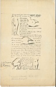 1 page in-4 mise au trait. Cinq détails de nu féminin sans tête : « à nous, la Femme sans tête est le véritable idéal. Tandis que la Vénus de Milo m’est insupportable avec son noble faciès d’académicien imberbe, la Vénus de Vienne me ravit par la nudité discrète de son torse dont aucun chef ne compromet là sa somptueuse animalité. Laissons à l’homme le : je pense, donc je suis ! La Femme n’a pas besoin de penser pour être. Tout le génie de madame de Staël pour la hanche d’Aspasie ! […] Ô Femme, contente-toi d’être la plus admirable des bêtes ! »…