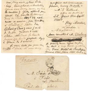 Bournemouth 25 [mars 1877], à Irénée Decroix ; 4 pages in-12, enveloppe. Toujours « accablé de travail, forcé d’écrire des lettres très importantes », il n’a pas eu le temps de lui « envoyer une missive digne de ce nom ». Il veut savoir si Irénée sera « du voyage à Londres » : Verlaine attend deux amis « dont Delahaye, triomphant et bachelier […] sur toutes les coutures  », par le bateau de Jeudi 29 qui part de Calais et arrive par Douvres à Londres à Charing Cross : « Je serais à cette station, attendant la bande joyeuse (si bande joyeuse il y a) à l’heure d’arrivée ». Il lui demande, s’il vient, de le confirmer immédiatement à l’adresse qu’il indique à Londres, chez E. Rolland à Hay Market, près de chez Viani où il prend son « repas du jour de midi à une heure quotidiennement », et dont il explique la longueur : « voilà tout le mystère de cette longue adresse nécessaire dans un monstre de ville comme Londres. Nous y resterions trois ou quatre jours et rappliquerions dans ce cher Pas-de-Calais ensemble. En tous cas serai à Arras quelques jours au plus tard après le Dimanche de Pâques, pour y rester quelques semaines jusqu’à mon départ Paris où l’on m’offre une position »... [Correspondance générale, 77-4.]. On joint une enveloppe autographe à Irénée Decroix à Fiefs par Heuchin (Pas-de-Calais), [Bournemouth 11 octobre 1876] (timbre découpé).