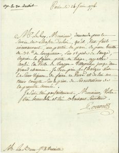 Paris ou Lyon 1776-1792 et s.d. ; 13 pages formats divers. 24 juin 1776, à Le Brun, ingénieur à Versailles : commande d’un grand pavé pour le service des chasses du Roi... 3 avril 1787. Rapport favorable sur un projet de pont de pierre sur pilotis à Lyon par Couland du Paillet, recommandé par Lallié... 5 mai 1789. Rapport défavorable sur le projet de Couland du Paillet, proposé pour le pont de l’archevêché de Lyon... 14 juillet 1789. Rapport au nom de l’assemblée des Ponts et Chaussées sur le projet de Couland du Paillet : « la méthode proposée est impraticable », mais si « contre toute espérance » l’expérience réussit, il serait juste d’en défrayer l’inventeur... 22 septembre 1792, à M. Mongenet, ingénieur ordinaire à Grenoble : il serait fort aise de contribuer à son avancement... Plus une feuille de billets de souscription à la Carte générale de France.