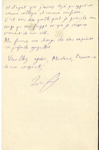 Condoléances : « J’ai été bien douloureusement surpris en voyant dans le journal l’annonce du deuil qui vous atteint et qui nous atteint tous. Mon souvenir se porte naturellement au voyage que j’ai fait il y a quelques années en Espagne avec celui que vous venez de perdre. C’est là surtout que j’avais vu de près ses qualités de cœur et d’esprit que j’avais déjà pu apprécier comme collègue et comme confrère »…