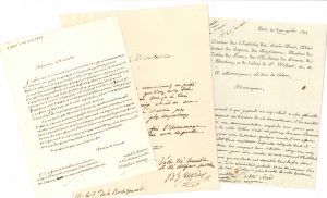 Jean-Louis Alibert (P.A.S. « Alibert premier médecin ordinaire du Roi », offrant sa Physiologie des passions). Nicolas Chambon de Montaux (2 intéressantes L.A.S., mai-juin 1820, au vicomte de La Rochefoucauld, au sujet de l’École de Médecine, où il faut combattre « les insidieuses conceptions des novateurs »). Georges Cuvier (L.A.S., 12 août 1826, au vicomte de La Rochefoucauld, remerciant pour un « présent magnifique »). Jean Demarquay (L.A.S., à son confrère le Dr Philips). Jean-Paul Grandjean de Fouchy (L.A.S. à un confrère au sujet d’un écrit de La Condamine). Joseph Récamier (P.A.S. comme « docteur médecin de l’Hôtel Dieu de Paris », 10 février 1829, certificat pour un jeune malade). Abbé Roch-Ambroise Sicard (L.A.S., 29 décembre 1812, au duc de Cadore, en faveur du négociant bruxellois Burton, qui soutient l’existence d’une multitude de familles indigentes, portrait gravé joint). Marie-François Vergez (L.S. comme chirurgien en chef de l’armée, Liège [29 juillet 1795], à son collègue Piette)... On joint 15 l.a.s. adr. au vicomte de Beauchesne, dont 12 du Dr Constantin James (plus qqs réponses de Beauchesne).