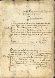 Double de la grand lieue confinee de la seigneurie de Mons, XVIe siècle ; cahier petit in-fol. de 157 pages, couv. parchemin de réemploi. Registre de la seigneurie de Mons (dans l’actuel département du Puy-de-Dôme), précisant les cens et droits seigneuriaux dus en argent ou en nature (« avoyne », froment, gélines…). Les entrées nominatives ou toponymiques donnent aussi des informations sur la profession des habitants (laboureur, chevrier…), la paroisse ou le lieu-dit d’habitation ou d’exploitation, et le terroir dont relèvent les terres ou maisons. On relève parmi les noms de lieux Jussat, Maringues, Mons, Randan, « Regnhat » (Reignat), Saint-Clément, Saint-Sylvestre…