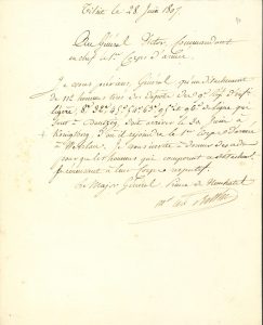 10 pages in-fol. ou in-4. Campagne de Pologne. Varsovie 12 janvier, envoi d’imprimés à compléter pour donner la situation du 10e corps d’armée… 17 janvier, pour connaître le nombre d’hommes malades, blessés et morts depuis l’ouverture de la campagne, dans le 10e corps d’armée… Tilsit 20 juin : l’armée ne fera aucun mouvement aujourd’hui, « il faut donc en profiter pour faire reposer le soldat et le faire laver s’il est possible »… 28 juin, au sujet d’un détachement de 112 hommes qui doit rejoindre à Wehlau le 1er corps d’armée qu’il commande… 29 juin, il a donné ordre au général Savary, gouverneur de Königsberg, de dissoudre le 14e régiment d’infanterie provisoire et d’en faire diriger une partie des troupes sur Wehlau… 2 juillet, sur « la nomination de M. Jourdain votre aide de camp au grade de capitaine »… Königsberg 13 juillet, la paix étant faite avec la Prusse, l’armée va se mettre en mouvement. « L’intention de l’Empereur est que votre corps d’armée se rende en droite ligne à Spandau pour tenir garnison sur les États de Prusse à la droite de l’Elbe et être à portée de la Poméranie Suédoise »… Fontainebleau 1er novembre : « Le régiment de Nassau et les troupes de Hesse-Darmstadt ne se rendront point, comme les autres troupes alliées du corps d’observon à Bayreuth. L’intention de l’Empereur est que ces troupes de Nassau et de Hesse restent dans la Prusse. Je charge en conséquence le Gal Molitor de les diriger sur Berlin »… On joint une L.S. au même, Paris 7 mars 1808, pour « réunir sur un seul point tous les militaires reconnus hors d’état de servir qui se trouvent soit à l’hopital de Custrin, soit dans les autres établissemens de l’armée ».