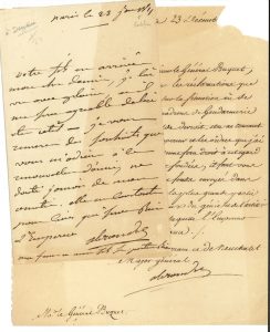 Paris 23 janvier 1811, à Antoine Denniée ; 1 page in-8. Il promet d’être utile au fils de l’intendant général, et lui rend ses vœux : son amitié « est constante pour ceux qui servent bien l’Empereur »… On joint une L.S., 23 décembre (coin déchiré), au général Buquet, à propos d’escadrons de gendarmerie en Espagne...