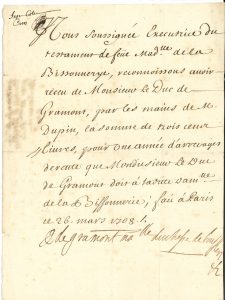 Paris 26 mars 1708 ; 1 page in-4. Comme exécutrice du testament de feue Mlle de La Bissonnerye, elle reçoit 300 livres du duc de Gramont, « par les mains de M. Dupin, […] pour une année d’arrerages de rente que Monsieur le Duc de Gramont doit à laditte Damlle de La Bissonnerie »…