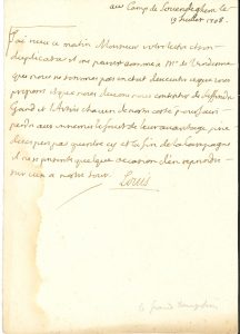 au camp de Lovendeghem 19 juillet 1708 ; demi-page grand in-8 (légère mouillure sur un bord). Guerre de succession d’Espagne dans les Pays-Bas espagnols. « Il me paroist comme a Mr de Vendosme que nous ne sommes pas en etat dexecuter ce que vous proposes et que nous devons nous continuer de deffendre Gand et l’Artois chacun de nostre costé pour faire perdre aux ennemis le secret de leur avantage je ne desespere pas quentre cy et la fin de la campagne il ne se presente quelque occasion d’en reprendre sur eux a nostre tour »…