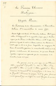 Chapitres mis au net pour une histoire de la Chouannerie en Bretagne : « Préface », « Introduction », « Les Premiers Chouans de Bretagne », et d’une autre main, « La Chouannerie dans les forêts », à pagination continue. On joint qqs ff. de notes (ajouts, vérifications), dont l’une à l’envers d’une enveloppe à l’adresse de M. Burdin d’Entremont, [1908], peut-être l’auteur du présent manuscrit [Maurice Burdin d’Entremont est l’auteur d’une étude sur l’armée danoise (1885)].