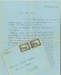 à son cousin Michel Lorthioir, à Bruxelles ; 6 pages in-4, enveloppe, beaux timbres du Congo belge. Relation par une jeune fille belge de son voyage, accompagnée de sa mère et sa sœur, en mer, de Flessingue (Pays-Bas) à Lobito (Angola), puis par train à Élisabethville (Congo belge), entre le 16 novembre et le 5 décembre 1939. Elle évoque des exercices de sauvetage et d’autres précautions (quelques jours plus tard, « les boches laissaient des souvenirs dans la Manche »)… On annonce des bateaux coulés et on entend dans la TSF l’explosion du bateau hollandais qui précédait le leur… Arrivée à Las Palmas le 22 novembre ; la ville paraît sordide, car « depuis la fin de la guerre d’Espagne, des Marocains y sont cantonnés. Ils vivent dehors »… à Lobito, une promenade en auto « sur des routes infâmes, étroites, longeant des ravins », est l’occasion d’observer des crocodiles ; les rigueurs du chemin de fer incluent une panne de la « loco » rafistolée par le mécanicien africain avec un morceau de boîte à conserve qui « tenait par l’Opération du St Esprit »…