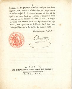Georges Jacques DANTON (1759-1794). Imprimé signé de sa griffe,