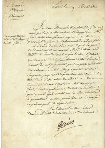Paris 19 mars 1810, à Fain, secrétaire archiviste de l’Empereur ; 1 page in-fol., adresse avec marque postale Ministère de la Marine et des Colonies. Au sujet de sa demande d’échange de son cousin Germain Fain, aspirant de la Marine, prisonnier de guerre au cautionnement de Chesterfield ; il solliciterait son échange, « si tout échange partiel n’étoit suspendu jusqu’à l’adoption d’un cartel général »…