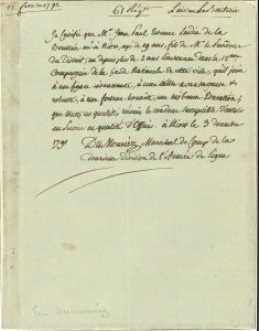 comme maréchal de camp de la 12e division de l’Armée de ligne, Niort 3 décembre 1792 ; demi-page in-4 (trace de collage au dos). Certificat pour Jean-Paul Estienne Laidin de La Bouterie, lieutenant dans la 12e Compagnie de la Garde Nationale de Niort, qui « joint à une figure interessante, à une taille avantageuse & robuste, à une fortune honnête, une très bonne éducation », pour entrer au service en qualité d’officier…