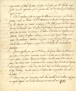 Little Ealing octobre-novembre 1821, à Louis-Philippe, duc d’Orléans ; 4 pages et quart in-4, adresses. Sur la situation en Europe et en Grèce. 24 octobre. Il lui a déjà raconté tout ce qu’il se rappelle sur le général Le Veneur, et il recommande de raisonner leur ami Valence, car il ne souhaite pas s’engager dans une guerre de plume, et il nie de même le projet d’écrire une histoire politique de l’Europe depuis sa « sortie » de France. Il pense comme lui sur la politique extérieure : « Le mystère impénétrable dont elle est enveloppée est la conséquence nécessaire du manque de fixité des plans, des idées contradictoires et des intérêts opposés de la Russie, de l’Autriche et de l’Angleterre, et enfin de l’absurdité des Turcs. Je crois que définitivement ce nœud gordien sera tranché par l’épée »... Il achève une adresse aux Grecs sous la signature de Léonidas... 11 novembre. Il serait bien aise de voir le duc de Richelieu continuer sa présidence du Conseil : « c’est un fil qui nous rattache à la Russie, et qui [...] nous garantit des insinuations du cabinet de St James, qui me paraît le plus obstiné, contre nos pauvres Grecs »... Il lui enverra M. Piecolos, pour l’instruire des affaires de la Grèce... Il évoque le voyage du Roi d’Angleterre en Autriche, où Metternich a eu peu de temps pour traiter… « s’il y a guerre entre la Russie et la Turquie, ce que je crois indubitable, elle commencera au printemps »…