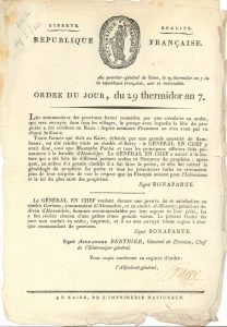 Q.G. du Kaire 29 thermidor VII et 13 vendémiaire VIII (16 août et 5 octobre 1799), signés respectivement par l’adjudant général Henry Sornet et l’adjudant général Jean-Gaspard-Pascal René (Au Kaire, de l’Imprimerie nationale) ; 2 ff. in-fol., le 2e impr. recto-verso, vignettes (bord effrangé et fente au 1er, le 2e lég. rogné sur un bord sans toucher le texte). 29 thermidor. Ordre de Bonaparte de publier en arabe des détails de « la fête du prophète » à laquelle le Général en chef a assisté, au Caire, témoignant du « respect que les Français avaient pour l’Islamisme » ; dons du Général en chef à deux cheikhs « recommandables par leur sagesse et leur piété »... 13 vendémiaire. Ordres de Kléber relatifs à l’habillement des hommes composant le train d’artillerie, à la fixation des prix des effets, à la défense de déporter des grains « ou marchandises quelconques » en Syrie, « sous peine de mort »...