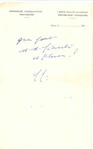 « Ch. G. » et carte de visite autographe signée « C.G. », ; demi-page in-8 à en-tête Assemblée Consultative Provisoire, et carte de visite. Paris [1945 ?] : « Que font M.M. Giacobi et Pleven ? »... Il signe « Ch. G. »… [Paul Giacobbi (1896-1951) et René Pleven (1901-1993), ministres de gouvernements de Gaulle (1944-1946).][Décembre 1954], avec un jeu d’épreuves du livre du lieutenant-colonel F.O. Mikshe, Tactique de la Guerre atomique (Paris, Payot, 1954). Il a pris connaissance « avec beaucoup d’intérêt » de ces épreuves : « Ce qui concerne l’avenir m’a paru plein de perspectives très dignes de considération. Quant au passé récent, il fera bien de ne pas trop se plier aux convenances et aux passions de Liddle-Hart ! »