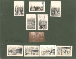 formats divers, montées sur feuilles cartonnées d’un album oblong in-4 broché (traces de photos décollées). Album numéroté « III », composé de clichés d’amateur et de quelques portraits professionnels, probablement réunis par un officier de cavalerie. La plupart des photographies sont données comme prises au cours de l’hiver 1916, dans les départements de la Somme, du Pas-de-Calais et de la Meuse : Nouvion en Ponthieu, Rollancourt, Vercourt, Verdun, Saint-Jean-sur-Moivre, etc. Certains personnages sont identifiés. Y figurent des représentations de soldats et officiers en campagne et au repos, un château qui sert de P.C., des canons, obus, gourbis, abris, etc.