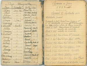 carnet in-12 de 78 pages, cart. dos toilé de réemploi (usagé).Mémoires de guerre d’un musicien d’infanterie alpine, mobilisé à Digne, le 3 septembre 1939. Les premières pages de ce journal de bord récapitulent ses étapes. Le 18 octobre a lieu son départ pour la Moselle, le 30 il traverse la ligne Maginot ; il note les étapes, répétitions, repas, corvées, déplacements, humeurs de ses compagnons, permissions, affectations dans l’Aisne et le Bas-Rhin. 28 avril 1940 : « concert au Camp de Bitche devant une entrée de la ligne Maginot. Après le concert nous visitons l’ouvrage qui est très bien avec ses galeries et tourelles » ; dans la nuit du 10 mai, passage d’avions, alertes ; le 11, « on apprend que les Allemands ont envahi la Belgique Hollande »… Il commence à noter les blessés et les morts, les réfugiés, le manque de vivres, la retraite dans les Vosges. Le 21 juin, à Brouvelieures, « ça pette, les Allemands sont près nous descendons à la cave de l’école » mais un quart d’heure plus tard, les Allemands sont aux portes, et les Français faits prisonniers. À Baccarat, le 25, « nous sommes réveillé par le bruit de cloches c’est la paix »… Ensuite, après avoir été « trimballés » en Lorraine, ils sont transférés au camp de Péronne le 15 septembre, où des travaux au Canal du Nord les attendent. Détails sur les conditions de vie, départ le 7 décembre pour le « camp n° 1 » dont Girard s’évade avec des camarades le soir du 19… Ils passent à Thiaucourt-le-Grand, Roye et Paris, prennent le train pour Bourges le 23 : « nous arrivons à St Florent s/Cher, en zone libre. […] Nous ne pouvons croire de ne plus voir de Fritz »… Le 25, il arrive par train à Manosque et monte à Valensole, « marchant péniblement dans la neige. […]Ma guerre est finie »…