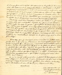 New-York 10 septembre 1827, à M. Duponceau à Philadelphie ; 2 pages in-4. Il veut démentir une fausse nouvelle : « Je reste proscrit, et le seul peut-être, je reste proscrit, parce que je n’ai jamais voulu descendre à un acte de faiblesse. Je ne suis point étonné que la police, piquée de ce que je l’ai bravée et me suis moqué d’elle, cherche, par d’insolentes calomnies, à me ravir le mérite d’un peu de constance et de fermeté dont j’ai peut-être fait preuve dans l’adversité ». Il s’étonne que les journaux américains répètent « les calomnies de la police […] contre un proscrit qui est venu chercher le repos sur la terre des Etats-Unis sans troubler celui des habitants »…