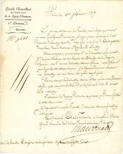 formats divers, en-têtes Grande Chancellerie ou Ordre national de la Légion d’honneur. Maréchal Macdonald duc de Tarente (4), vicomte de Saint-Mars, maréchal comte Maurice Gérard ; Jean-Pierre Lallemant (serment de fidélité, 1817) ; brevet de 1889 avec griffes du Président Sadi Carnot et du général Victor Février ; plus 2 lettres jointes.