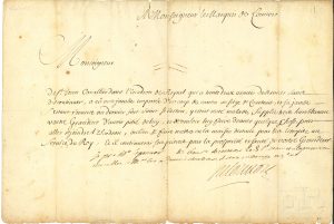 1 page oblong in-fol. et 1 page in-4. 3 octobre [1670]. Au bas d’une supplique de Saint-Jean, cavalier dans l’escadron de Reynel, qui a eu une jambe emportée d’un coup de canon au siège de Courtrai et demande une place « en la maison destinee pour les estropiez au service du Roy », il demande de le recevoir et de l’interroger. Versailles 25 septembre 1672, à M. de Bissy : sa lettre lui a appris ses raisons « pour ne pas laisser establir les comediens à Nancy, elles sont fort bonnes, et vous avez assurement bien fait den uzer de la sorte »... On joint 2 L.A.S. d’Auguste-Michel Le Tellier de Souvré, marquis de Louvois (1840-1841).