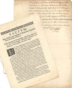 Factum pour messire Jean Baptiste de Montolieu, capitaine d’une des Galleres du Roy, contre des marchands de Marseille et des marchands anglais, [1657]. Nomination de l’enseigne de vaisseau Ruis comme aide-major dans la campagne aux Antilles, signée en mer par le capitaine de vaisseau Duguay, à bord du Magnanime (1745). Copie conforme d’une lettre de Sartine à La Touche-Tréville au sujet de la pêche par les navires anglais (1779).