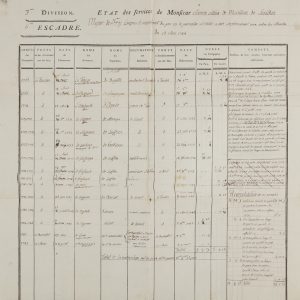 Bel ensemble sur la carrière du capitaine de vaisseau Étienne Massilian de Sanilhac (Montpellier 1748-1827). [Massilian de Sanilhac commença à servir dans la marine en qualité de volontaire en 1765. Il fut reçu garde de la marine le 12 janvier 1766, enseigne de vaisseau (1773) et lieutenant de vaisseau (1779). Chevalier de l’ordre de Saint-Louis en 1780 « en récompense d’une blessure reçue au combat livré devant la Grenade », il est ensuite promu major de vaisseau (1786) et enfin capitaine de vaisseau en 1814. Il a servi dans des bâtiments sous le commandement de Forbin d’Oppede, Castellane-Majastre, et surtout, dans plusieurs campagnes, sous Suffren, notamment en 1778-1779 lors des guerres d’Indépendance américaine. Il participa également à des campagnes en Méditerranée, à la guerre de Tunis (1770), dans le Levant, à Newport contre l’amiral Barrington (1778) et aux Caraïbes contre l’amiral Byron (1779). Franc-maçon, Massilian de Sanilhac était membre de la loge de la marine La Parfaite Harmonie de Toulon.] état des services en mer pour la période 1765-1789, grand placard rempli par Massilian de Sanilhac (plus une copie de 1816 avec lettre d’accompagnement). état de services à terre pour la période 1766-1791, établi par le Bureau des Revues de Toulon en 1815. Extrait du registre des conseils extraordinaires tenu le 7 octobre 1787 au bureau de la Majorité générale de la Marine pour l’examen des capitaines commandant des bâtiments à leur désarmement, délivrant à Massilian de Sanilhac un certificat pour bonne conduite durant la campagne sur les côtes françaises à bord du Gave. 12 lettres à lui adressées, relatives à l’attribution de sa décoration du Lys (1814), à sa pension de retraite (1815-1816, certaines par les ministres de la marine Beugnot et Gratet, plus le brevet de sa pension), à sa pension d’infirmité, à sa demande de pension en qualité de Chevalier de Saint-Louis (1825-1828, par le ministre Chabrol de Crouzol et le maire de Montpellier Cambacérès, plus une copie autographe de la demande de pension de Massilian auprès du ministre), etc. On joint 3 copies de pièces produites par les héritiers de Massilian (acte de décès, certificat de propriété, déclaration des héritiers), et une lettre du préfet de l’Hérault à eux adressée.