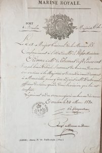 1 page in-fol. chaque, en-têtes Marine-Royale, la plupart avec vignette et cachet encre (qqs lég. défauts). Expédition d’Alger. Ordres de service pour Joseph-Henri-Gabriel de Thomas de Saint-Laurent (1798-1836), lieutenant de vaisseau : « de cesser ses services à la Majorité, et de descendre immédiatement à Marseille pour y être adjoint à M. Dubreuil » (Toulon 24 mars) ; « d’effectuer son retour à Toulon le 12 mai 1830 » (7 mai) ; « de continuer ses services à terre à Torre Chica [Alger] auprès de Mr le Capit. de vau Bon Hugon. Cet officier comptera sur la corvette la Créole pour la solde et le traitement de table qui lui seront acquis individuellement » (Provence 28 juin) ; « de débarquer demain 1er octobre de la corvette la Créole », pour se mettre à la disposition du préfet maritime de Toulon (L’Alger 30 septembre).