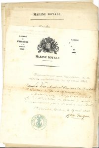 la plupart signées, à lui adressées, 1823-1859. Congé de l’école Polytechnique signée par le vicomte Pailhou, sous-gouverneur, 1825. Permissions et congés, laissez-passer et ordres d’embarquer. Avis de promotion au grade d’officier de la Légion d’honneur, 1844. Feuilles de route avec visas, 1849-1856. Nominations et instructions signées par les ministres successifs : Chabrol, Hyde de Neuville, Rigny, Duperré, Mackau, Montebello, Cazy, Verninac, Tracy, Ducos, Hamelin. D’autres documents signés par Bastide, ministre des Affaires étrangères, Tastu, consul de France à Carthagène, Bresson, ambassadeur de France à Madrid. Plus un dossier de documents ayant trait à un nouveau projet d’organisation de l’École navale, vers 1849. On joint un dossier de manuscrits et notes autographes, vers 1841-1870 (environ 100 p. formats divers) : notes de lecture ; procès-verbal d’Exercice du pistolet à piston, nouveau modèle (1841) ; discours sur L’Homme et la Bête, étude physiologique et morale à l’Académie des Jeux-floraux (1870). Avec une brochure impr., Projet d’organisation des forces navales (1848), des coupures de presse, circulaires, travaux parlementaires, etc.