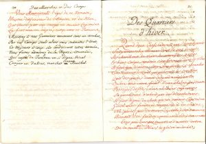 le second avec quelques additions et corrections autographes ; cahier de 45 pages in-4 à l’encre brune et rouge, tranches dorées, couverture cartonnée de papier peigné, et cahier de 20 pages in-fol. lié d’un ruban rose. Sur l’art militaire, en hommage à Frédéric II de Prusse. * Principes généraux sur les parties les plus essentielles de la Science militaire, tant extraits litteralement du Poeme de l’art de la guerre imprimé à Sans-Souci 1760, qu’imités pour le style et pour les maximes d’après ce modèle. Recueil soigneusement calligraphié, en partie à l’encre rouge, de 8 pièces de vers : De l’Étude Militaire, De la Discipline, De la Marche, Des Marches et des Camps, Des Quartiers d’hiver, Des Sièges, Des Batailles, Des Retraites. Citons le début du poème liminaire : « Venez, jeunes guerriers, c’est Mars qui vous appelle, […] Un Astre dans le Nord a chassé les tenèbres, Et l’aveugle routine adoptée autrefois Fait place de nos jours à de sublimes loix »… * Reflections sur la discipline militaire ou sur les effets politiques quelle a produit de nos jours. 1ère partie Discipline militaire. Essai didactique auquel Monteil a ajouté de sa main en marge une longue note sur la notion d’honneur. « Il ne paroit pas que le roy de Prusse ait entendu par l’honneur ce sentiment romanesque et indefinissable par lequel des administrateurs moins philosophes que luy ont cru pouvoir exiger de la multitude et pour de petit interet les efforts que les passions les plus heroiques nobtienent pas des hommes les plus extraordinaires, je veux dire cette abnegation totale de soy-mesme qui fait mepriser les richesses, les douceurs de la vie et la vie mesme », etc.