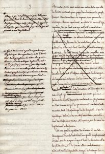 Moyens d’exécution d’un projet de modification à l’acte constitutionel, [1795 ?] ; 45 pages in-fol. paginé 1-58 (manquent les p. 11-14, 31-32, 37-38, 45-46, 51-52). Réflexions sur la Constitution de l’An III, qui fonda le Directoire et les Conseils des Cinq-Cents et des Anciens. Ce travail a été certainement élaboré lors du retour en France du général, après son exil en Suisse. Sur ce manuscrit mis au net par un copiste, le général de Montesquiou a porté de nombreuses corrections, avec d’importantes additions dans les marges ; il a également biffé des passages entiers ; d’autres pages sont entièrement autographes (pages 15 à 17, ou les pages 19 et 23-24 qui remplacent la version primitive biffée). Montesquiou examine les moyens de valoriser l’expérience des législateurs, en facilitant les réformes constitutionnelles. Il fait peu de cas de la Déclaration des Droits de l’Homme : les hommes simples auraient préféré une monarchie libératrice. Il brosse un tableau des épouvantables tragédies de la Révolution : « Le mot républicain a été flétri dez sa naissance. Il l’a été au point quaujourdui même il n’est pas épuré », et cependant l’existence de la République n’est pas douteuse ; l’établissement républicain français est conforme à la volonté nationale et durable. Il recommande des réformes promptes : « l’exercice de la souveraineté du peuple est à la fois le principe universel de notre institution, et son moyen de perfection, dez qu’il sera mis en pratique comme le premier des devoirs, et reglé d’après une théorie simple, alors il donnera à la volonté nationale l’empire qu’elle doit avoir sur tous les partis disposez à la combattre, et qui l’ont combattuë jusqu’à présent avec des succès toujours variéz, et toujours funestes »… Etc.
