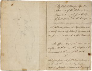 par l’amiral Robert Plampin, commandant en chef au Cap de Bonne-Espérance et dans les mers adjacentes, [1818] ; petit cahier in-8 de 27 pages broché sous couv. de papier gris, sous emboîtage percaline bleu nuit, titre doré sur le plat sup. Règlement pour la surveillance maritime autour de Sainte-Hélène, avec un portrait de Napoléon sur le vif. Ce règlement a été élaboré par l’amiral Pamplin, chargé, après l’amiral Pulteney Malcolm, de surveiller la circulation maritime autour de Sainte-Hélène afin d’empêcher toute tentative d’évasion de Napoléon. Ce règlement en anglais se compose de 28 articles, et est destiné aux officiers des vaisseaux de Sa Majesté qui pourraient mouiller à Sainte-Hélène, leur interdisant notamment (art. 3) de « visiter Longwood ni ses alentours, ni communiquer par écrit ou autrement sur quelque sujet que ce soit avec les personnages étrangers détenus sur cette île sans avoir reçu l’autorisation du Commandant en chef »... D’autres articles concernent l’accès de l’île aux bateaux de S.M., leur garde (en particulier la nuit), les droits des vaisseaux marchands, la signalisation (avec 2 petits drapeaux aquarellés), la pêche et l’approvisionnement, la santé... En tête du livret, on a collé un dessin à la mine de plomb (18,2 x 8 cm) représentant sur le vif Napoléon debout, de profil, en tenue de grenadier de la Garde et coiffé de son fameux chapeau. Au verso, on a collé une note en anglais signée « J. Clark o.m », datée Dead Wood 27 novembre 1818 : « all is well with respect to General Buonaparte »...