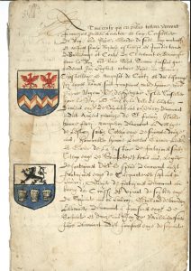 Conti 16 avril 1585 ; cahier in-fol. de 5 pages. Preuves de noblesse de Jean de Maucomble et sa femme, damoiselle Péronne de Boutry. Expédition d’un acte notarié, orné de deux armoiries peintes, établi par François Pullen, garde du scel au bailliage et comté de Clermont-en-Beauvaisis.